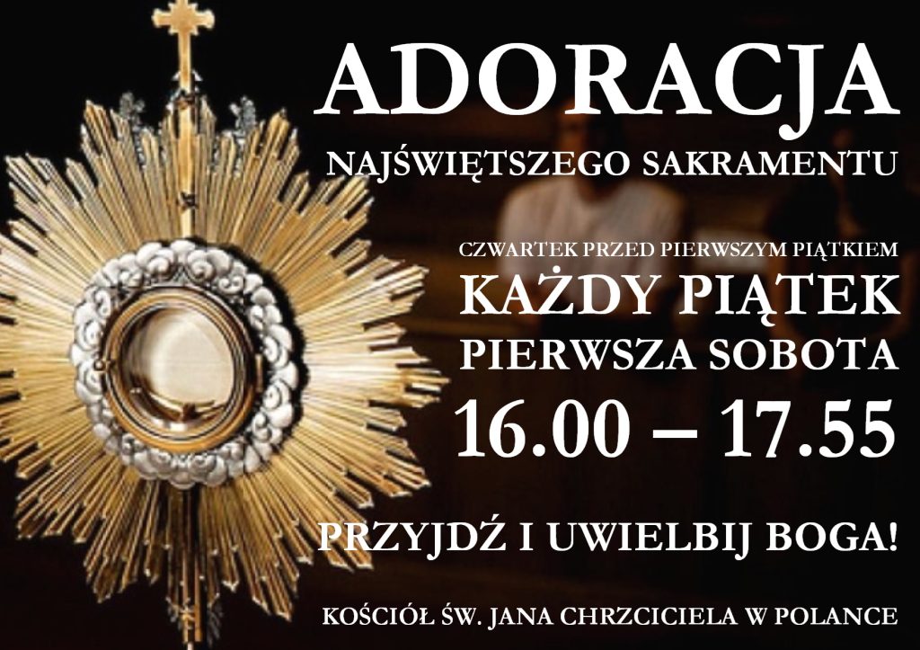 - W sobotę Adoracja Najświętszego Sakramentu od 16.00 do 18.00. Na zakończenie adoracji, o 17.45 odmówimy Koronka do Bożego.