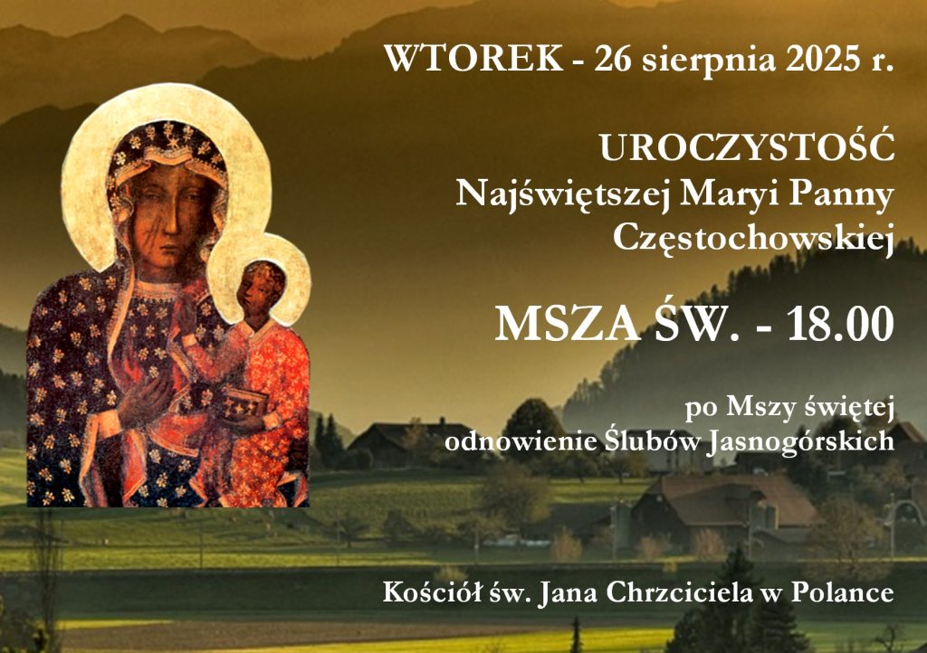 - We wtorek 26 sierpnia – uroczystość NMP Częstochowskiej. Po Mszy św. o godz. 18.00 odnowimy Śluby Jasnogórskie.