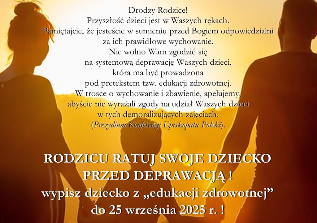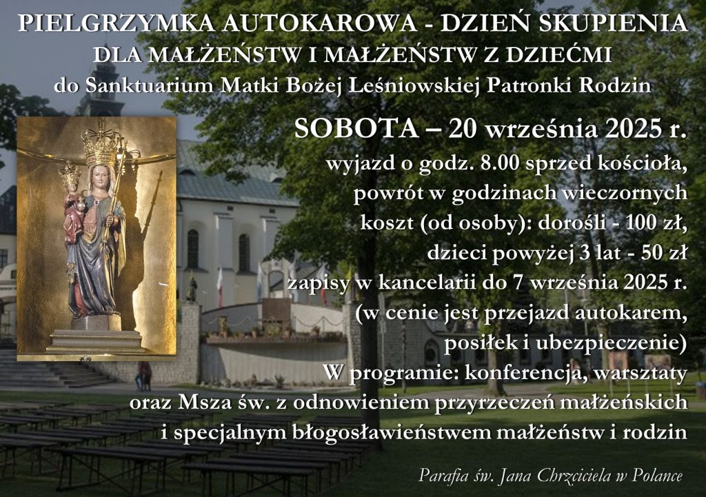 - Zapraszam na pielgrzymkę autokarową – dzień skupienia dla małżeństw i małżeństw z dziećmi – do Sanktuarium Matki Bożej Leśniowskiej Patronki Rodzin – w sobotę 20 września 2025. W programie, konferencja, warsztaty oraz Msza św. z odnowieniem przyrzeczeń małżeńskich i specjalnym błogosławieństwem małżeństw i rodzin. Wyjazd o godz. 8.00, powrót w godzinach wieczornych. Koszt (od osoby): dorośli 100 zł, dzieci do 3 lat bezpłatnie, powyżej 3 lat 50 zł. Zapisy w kancelarii do 7 września 2025 r.