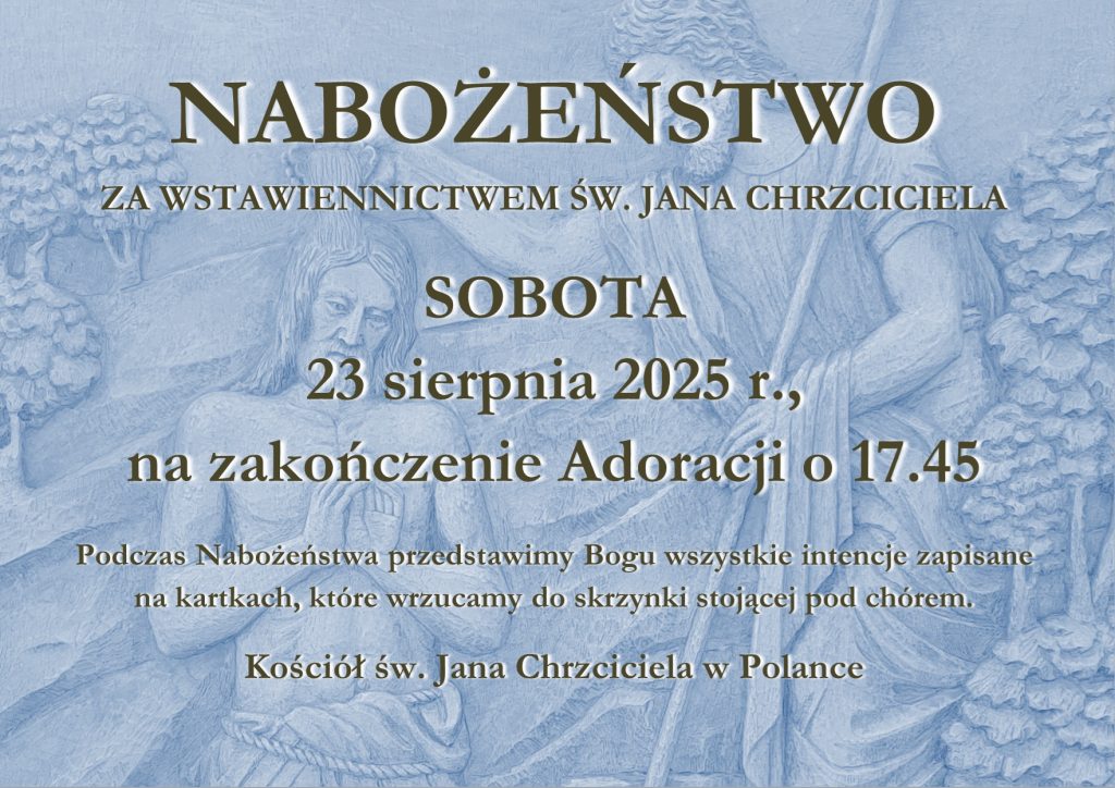 - W piątek 29 sierpnia – wspomnienie męczeństwa św. Jana Chrzciciela. Na zakończenie adoracji o 17.45 odmówimy Litanię ku czci św. Jana Chrzciciela.