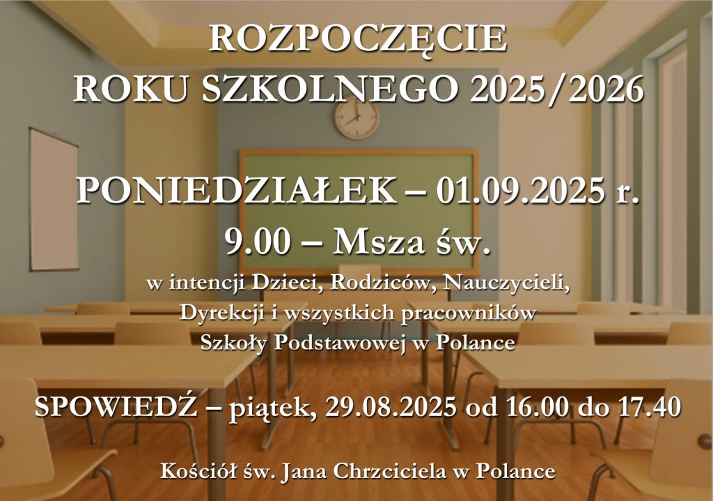 - Rozpoczęcie nowego roku szkolnego będzie w poniedziałek 1 września 2025 r. O godz. 9.00 będzie Msza św. W intencji dzieci, rodziców, nauczycieli, dyrekcji i wszystkich pracowników Szkoły Podstawowej w Polance.