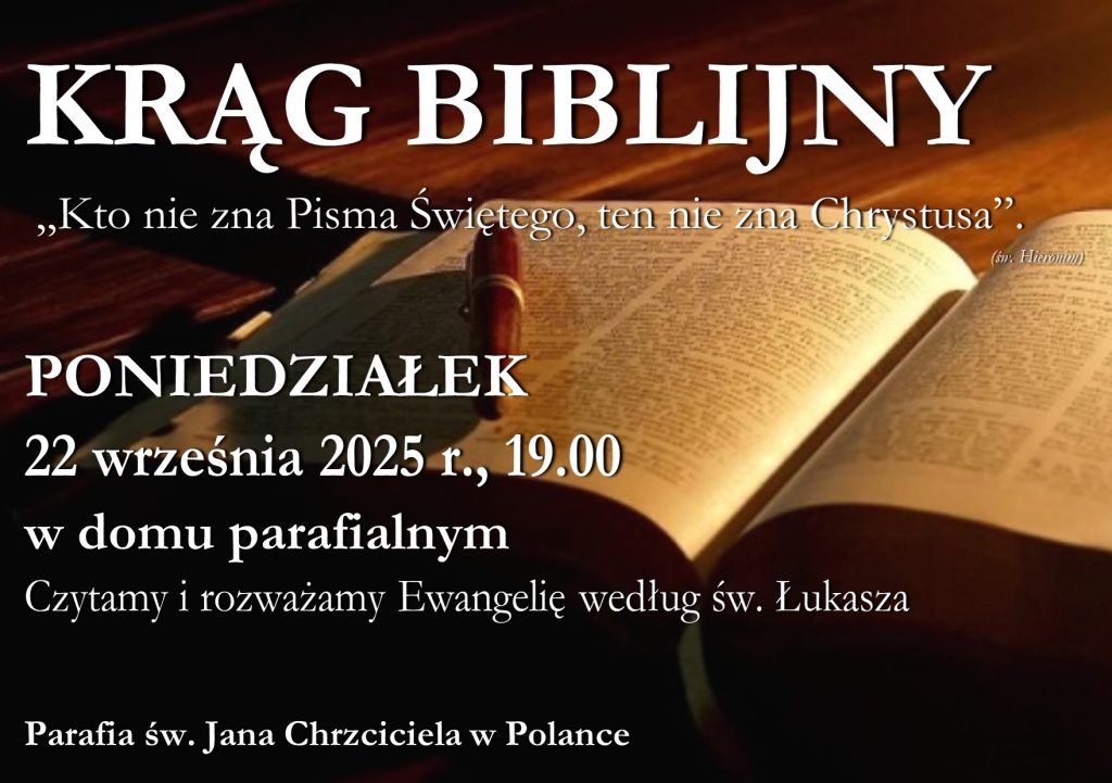 - Spotkanie Kręgu Biblijnego będzie w poniedziałek 22 września, o godz. 19.00. Czytamy Ewangelię według św. Łukasza. Zapraszam wszystkich chętnych.