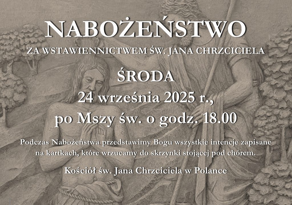 - W środę 24 września po Mszy św. o godz. 18.00 będzie Nabożeństwo ku czci św. Jana Chrzciciela. Podczas nabożeństwo polecimy Bogu przez wstawiennictwo św. Jana intencje zapisane na kartkach i wrzucone do skrzynki przy ołtarzu.