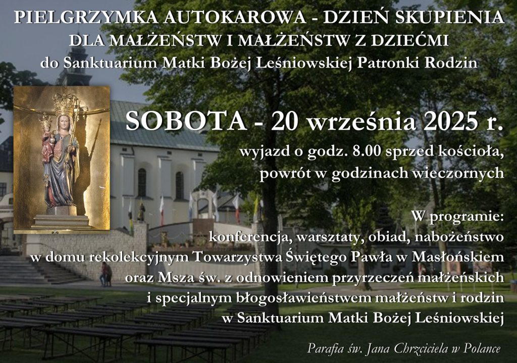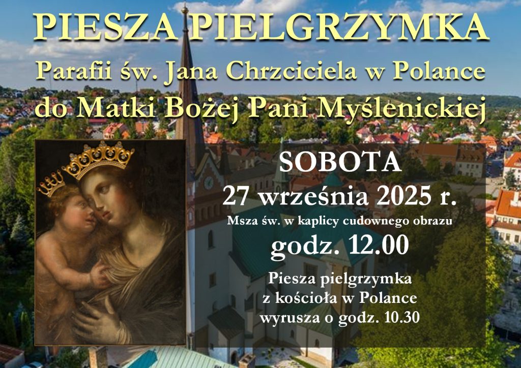 - Zapraszam wszystkich na IV pieszą pielgrzymkę do Sanktuarium Pani Myślenickiej w sobotę 27 września. O godz. 12.00 w kaplicy Matki Bożej Myślenickiej odprawimy Msze św. i oddamy się w Jej opiekę. Kto może i czuje się na siłach pójdzie pieszo, kto nie da rady niech dojedzie sobie samochodem, albo autobusem. Pielgrzymka piesza wyjdzie sprzed kościoła w Polance o godz. 10.30.