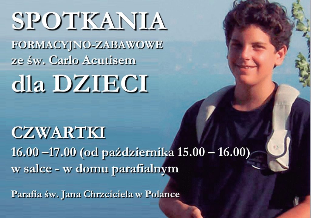 - Zapraszam na spotkania formacyjno-zabawowe ze św. Carlo Acutisem dla dzieci. Spotkania odbywają się w każdy czwartek od 16.00 do 17.00 (od października od 15.00 do 16.00) w salce – w domu parafialnym.