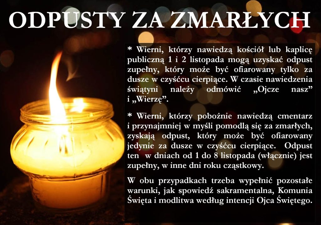 - Wierni, którzy nawiedzą kościół lub kaplicę publiczną 1 i 2 listopada mogą uzyskać odpust zupełny, który może być ofiarowany tylko za dusze w czyśćcu cierpiące. W czasie nawiedzenia świątyni należy odmówić „Ojcze nasz” i „Wierzę”. Odpust ten można uzyskać tylko jeden raz w ciągu dnia. Wierni, którzy pobożnie nawiedzą cmentarz i przynajmniej w myśli pomodlą się za zmarłych, zyskają odpust, który może być ofiarowany jedynie za dusze w czyśćcu cierpiące. Odpust ten w dniach od 1 do 8 listopada (włącznie) jest zupełny, w inne dni roku cząstkowy. W obu przypadkach trzeba wypełnić pozostałe warunki, jak spowiedź sakramentalna, Komunia Święta i modlitwa według intencji Ojca Świętego.