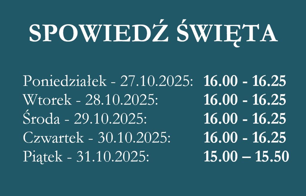 - Możliwość spowiedzi w najbliższym tygodniu: od poniedziałku do czwartku włącznie: 16.00 – 16.25; w piątek: 15.00 – 15.50.