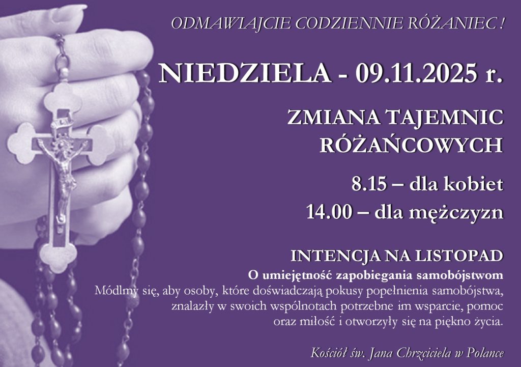 - Zmiana tajemnic różańcowych będzie w niedzielę 9 listopada – dla kobiet o godz. 8.15; dla mężczyzn o godz. 14.00;
