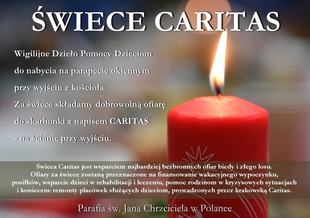 - Od dzisiaj na parapecie przy wyjściu z kościoła są do nabycia świece Caritas. Jest to nasza pomoc dla potrzebujących. Za świece składamy dobrowolną ofiarę do skarbonki z napisem CARITAS.