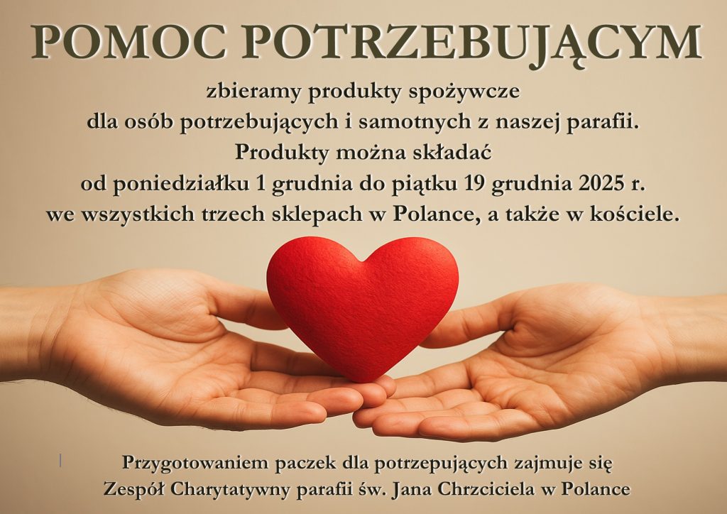 - Od poniedziałku – 1 grudnia do piątku 19 grudnia będziemy zbierać produkty spożywcze dla osób potrzebujących i samotnych z naszej parafii. Produkty będzie można składać we wszystkich trzech sklepach w Polance, a także w kościele. Przygotowaniem paczek dla potrzepujących zajmuje się Zespół Charytatywny naszej parafii.