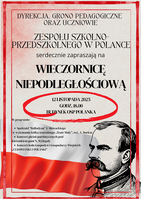 Dyrektor Zespołu Szkolno – Przedszkolnego w Polance zaprasza wszystkich mieszkańców na Wieczornicę Niepodległościowo Patriotyczną, która odbędzie się 12 listopada 2025 roku (środa) o godzinie 18.00 w Strażnicy OSP Polanka. W programie: przedstawienie Balladyna wykonane przez Uczniów Szkoły w Polance pod opieką pani mgr Agaty Burkat; pieśni patriotyczne zaśpiewane przez uczniów Szkoły z Polanki pod opieką pani mgr Natalii Wylegały; występ Koła Gospodyń i Gospodarzy Cudawianki z Polanki; wspólne śpiewanie pieśni patriotycznych. Serdecznie Zapraszamy.