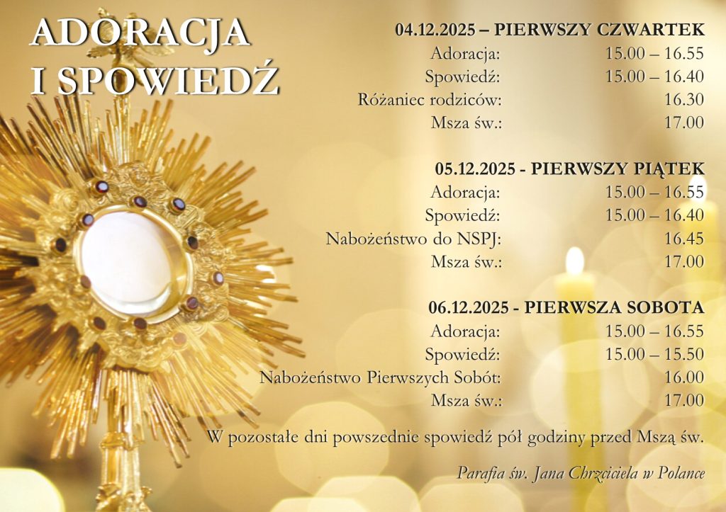 - W tym tygodniu będzie pierwszy czwartek, piątek i sobota. Adoracja Najświętszego Sakramentu w te dni będzie od godz. 15.00 do 16.55. Możliwość spowiedzi podczas adoracji: czwartek i piątek od 15.00 do 16.40; w sobotę od 15.00 do 15.50. W pozostałe dni powszednie 30 minut przed każdą Mszą św.