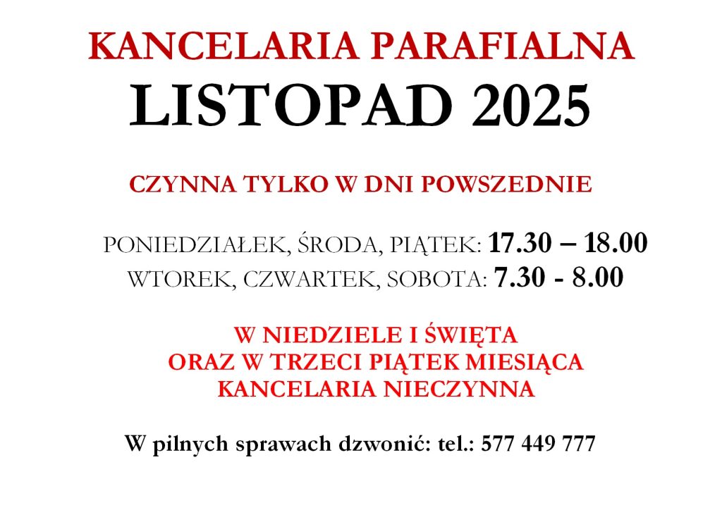 - Za tydzień w niedzielę 16 listopada będzie spotkanie Chóru Rodzinnego. Próba śpiewu odbędzie się w salce o godz. 9.30 (wejście z tyłu domu parafialnego); śpiew podczas Mszy św. – 10.30.