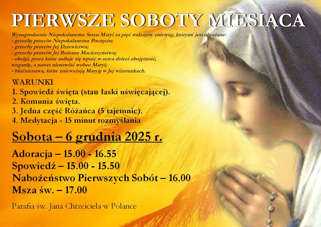 - W sobotę Nabożeństwo Pięciu Pierwszych Sobót Miesiąca ku czci Niepokalanego Serca NMP będzie o godz. 16.00. Najpierw odmówimy różaniec, a potem będzie medytacja.