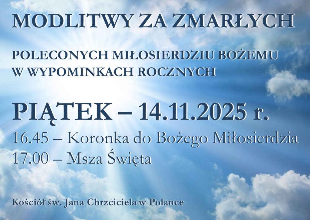 - W piątek o godz. 16.45 Koronka do Bożego Miłosierdzia, a o 17.00 Msza św. w intencji zmarłych poleconych Bogu w wypominkach.