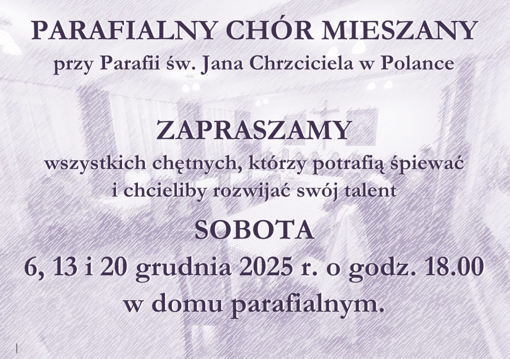 - Zapraszam wszystkich do wzięcia udziału w konkursie plastycznym „KWIATY Z BIBUŁY”, który adresowany jest do dzieci, młodzieży i dorosłych. Prace konkursowe należy dostarczyć do zakrystii lub kancelarii do niedzieli, 4 stycznia 2026 r. Regulamin konkursu dostępny na stronie www.parafiapolanka.pl i w gablocie.
