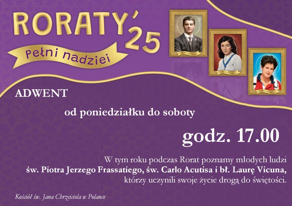 - Roraty w naszym kościele będą w dni powszednie od poniedziałku do soboty o godz. 17.00. zachęcam wszystkich do przychodzenia na Roraty z lampionami. W tym roku podczas Rorat będziemy poznawać młodych ludzi św. Piotra Jerzego Frassatiego, św. Carlo Acutisa i bł. Laurę Vicuna, którzy uczynili swoje życie drogą do świętości. Dzieci podczas Rorat będą otrzymywały obrazki.