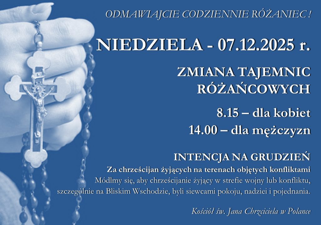 - W przyszłą niedzielę – 7 grudnia będzie zmiana tajemnic różańcowych: dla kobiet o 8.15, dla mężczyzn o 14.00. Papieska intencja na grudzień: Za chrześcijan żyjących na terenach objętych konfliktami. Módlmy się, aby chrześcijanie żyjący w strefie wojny lub konfliktu, szczególnie na Bliskim Wschodzie, byli siewcami pokoju, nadziei i pojednania.