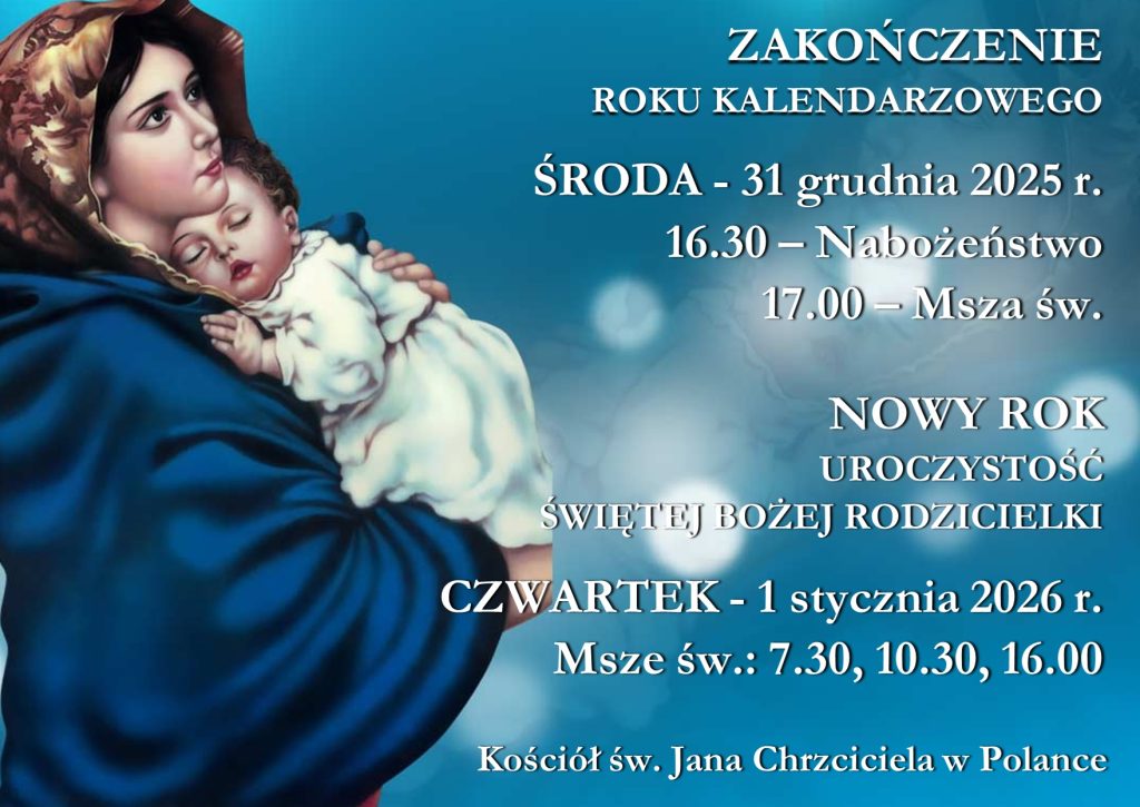 - W czwartek, 1 stycznia Nowy Rok – Uroczystość Bożej Rodzicielki. Msze św. o 7.30, 10.30 i 16.00.