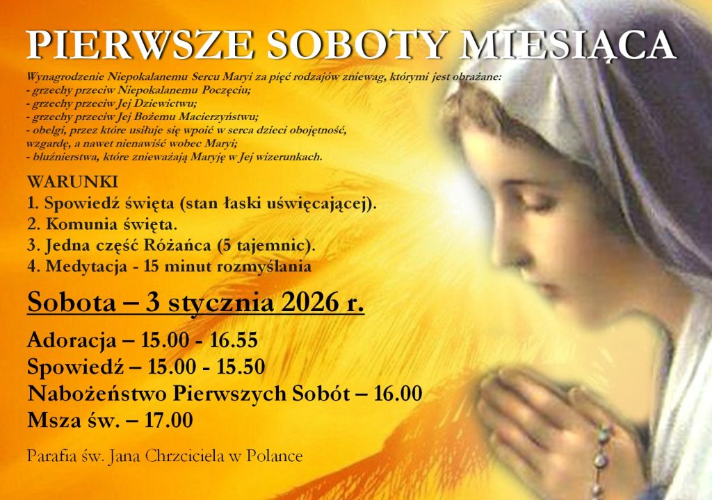 - W sobotę, 3 stycznia o 16.00 będzie Nabożeństwo ku czci Niepokalanego Serca NMP. Najpierw odmówimy Różaniec, a potem będzie 15 minutowa medytacja.