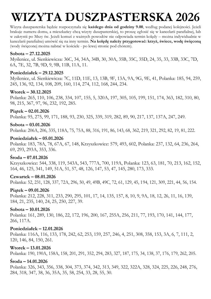 - W sobotę po świętach rozpocznie się wizyta duszpasterska. Wizyta duszpasterska będzie rozpoczynała się każdego dnia od godziny 9.00, według podanej kolejności. Jeżeli kogoś brakuje na liście, a mieszkańcy chcą wizyty duszpasterskiej, to proszę zgłosić się w kancelarii parafialnej lub w zakrystii.