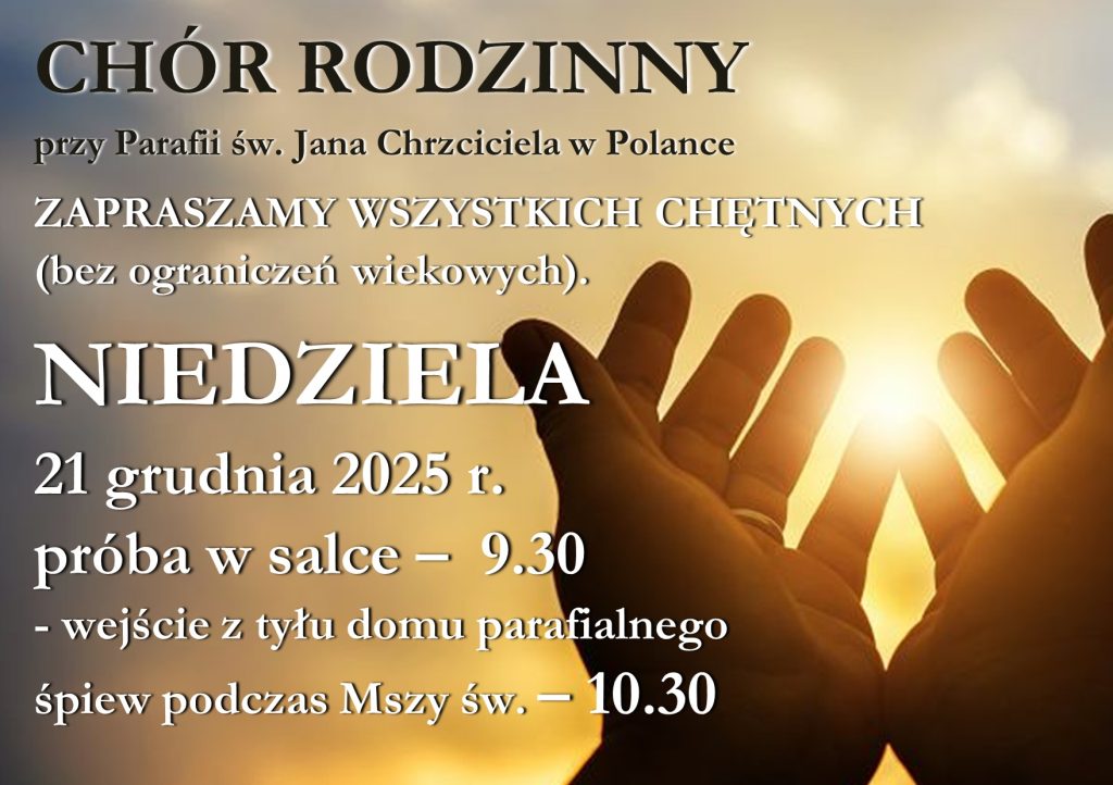 - W Niedzielę, 28 grudnia 2025 r., w Święto Świętej Rodziny w naszym kościele na wszystkich Mszach świętych będzie odnowienie przyrzeczeń małżeńskich. Bardzo proszę aby w tym dniu małżonkowie nie tylko przyszli razem do kościoła, ale także razem usiedli w kościele.
