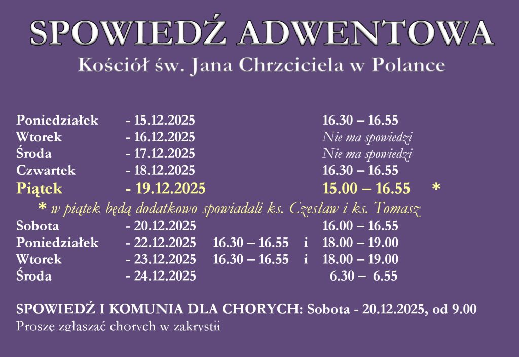 - Spowiedź przed świętami: poniedziałek, 22.12.2025, 16.30 – 16.55 i 18.00 – 19.00; wtorek, 23.12.2025, 16.30 – 16.55 i 18.00 – 19.00; środa, 24.12.2025, 6.30 – 6.55.